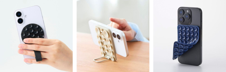 ラインアップは落下防止に役立つバンド付きタイプ、動画視聴に便利なスタンド機能付きタイプ、MagSafe非対応でも使える両面吸盤タイプの3つ。両面吸盤タイプには、通常タイプとスタンド付きの2種類を用意する。カラーはネイビー、ベージュ、ブラックの3色展開。