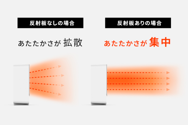 「リフレクトヒーター ぽかエコー」は、本体背面を向いたヒーターの熱を反射板で反射させることで、熱が部屋全体に拡散することなく前方に集中し、ほしいところへ集中的にあたたかさを届けられる。