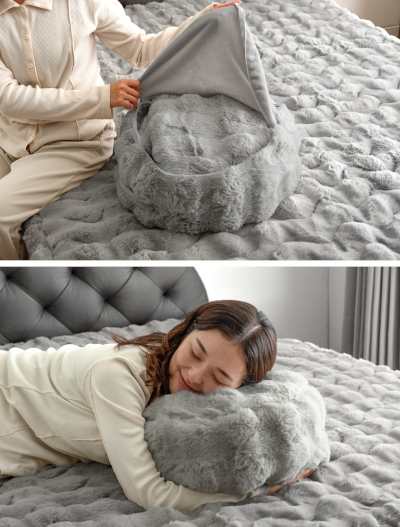 使用しないときは付属の収納ケースに入れて、クッションとしても使用できる。収納ケースは「もはや、うさぎ。」本体と同じ素材を使用しているので、部屋の雰囲気を崩すことなくインテリアになじむ。また、ファスナー付きで出し入れがしやすく、リビングやベッドサイドに置いておくだけで見た目にもかわいらしいアクセントになる。