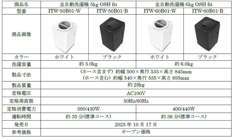 アイリスオーヤマは10月17日から、同社の製品としては最速となる約9分で洗濯が完了する「特急(1kg)コース」を搭載した「全自動洗濯機5kg/6kg OSH fit(オッシュ フィット)」を順次発売する。どちらも、カラーはホワイト、ブラックの2色で、価格はオープン。