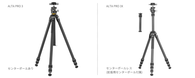 「ALTA PRO 3」シリーズは「安定性」をコンセプトに設計され、センターポールを搭載することで安定感を重視しつつ柔軟な高さ調整に対応し、幅広い撮影スタイルに対応できる。