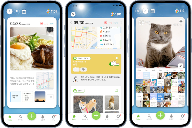 スマートフォンが記録している「今日のできごと」を自動で収集し、1日1ページに思い出として記録するため、集まった記録の中から「今日の表紙」を毎日1つ選べば、後から振り返って楽しめる「LIFEのBOOK」がつくられる。