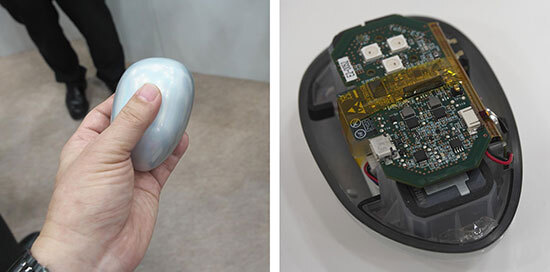 このほかの出展では、村田製作所のふしぎな石ころ「echorb」も面白かった。大阪万博にも出展していたものだ。手に持つと、特殊な振動によって、あたかも引っ張られたり左右に動かされたりする感覚が生まれる。また、耳を近づけると、スピーカーがついていないにもかかわらず、雨粒が落ちるような音を聴くこともできる。「3Dハプティクス技術」によるものだという。「振動で脳を錯覚させ「引っ張られるような『力覚』、堅さ・柔らかさという『圧覚』、触り心地につながる『触覚』を再現」する。錯覚を生じさせるのは「アクチュエーター」と呼ばれる振動素子。特にechorbに採用されたものは、2軸方向に振動するのが大きな特徴だ。これによって360度どの方向へも引っ張られるような感覚を生み出すことができる。今後は、ゲームやイベントへの利用、視覚障碍者の誘導などへの応用も目指しているという。