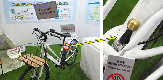 アクチュエーターといえば、太陽誘電も積層電圧アクチュエーターを応用した「振動スピーカー」のプロトタイプを展示していた。ブースには自転車が1台置かれ、音楽が流れている。しかしどこから音がしているのかイマイチわからない。よくよく見ると、後輪近くのフレームに小さなユニットが装着されていて、その振動がフレーム全体に伝わり、自転車そのものから音が出るようになっていた。以前から、テーブルに置いてテーブル全体をスピーカーにするような製品はあったが、それよりも小型で音がクリア。かなり大きな音も出せるようになっている。災害時に自転車に乗って近隣の人たちに避難を呼びかける時などにも応用できそうだ。