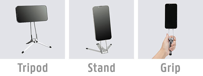 安定した状態で撮影やビデオ通話が可能な「三脚」、ハンズフリーで動画視聴などが可能な「スタンド」、片手で持ちながら操作でき、落下防止用のグリップとしても機能する「グリップ」の3通りの使い方を用意し、さまざまなシーンに対応する。