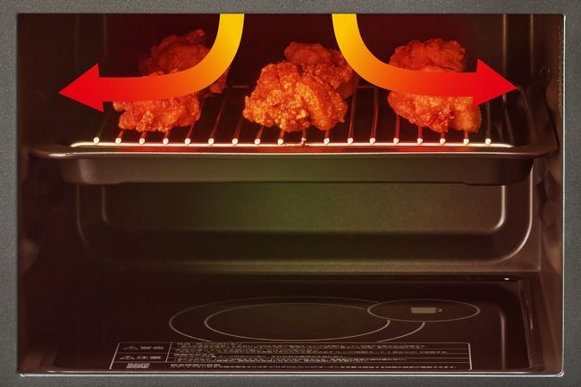 背面や側面に位置するのが一般的なコンベクションファンを上面に配置。調理してから時間が経った惣菜から出た余分な水分や油分を、上からの熱風で効率よく落とし、おいしく仕上げる。さらに、食材を焼網に乗せることで、網の隙間から油を落としてカラッと軽い食感になり、熱風が食材の下側まで包み込むように届くことで、食材を裏返すことなく両面がサクサクになる。