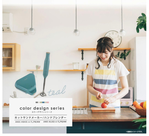 「カラーデザインシリーズ」は、「くすみカラー」が特長の家電シリーズで、今回発売される「ハンドブレンダー」および「ホットサンドメーカー」は、ティール、ピンクベージュ、モカホワイトの3色を用意している。