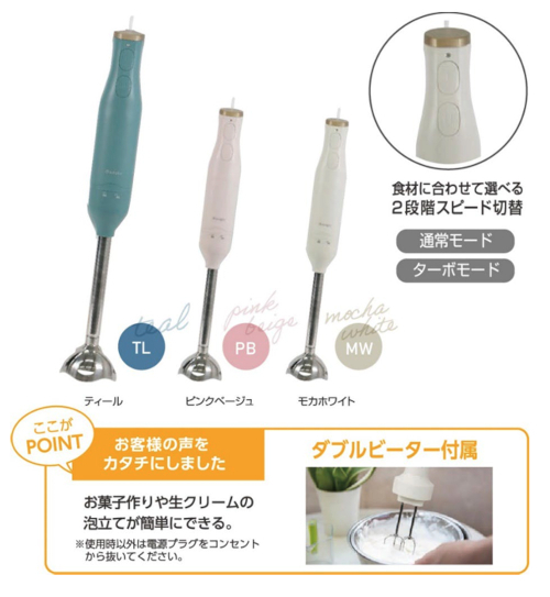 「ハンドブレンダー」は、食材を「つぶす・混ぜる」際に使用するブレンダーと、「泡立てる」際に使用するビーターの2種類のアタッチメントが付属し、フレッシュジュースやポタージュ作りといった料理から、生クリームの泡立てなどお菓子作りまで、幅広く使用できる。スピードは、食材や用途に合わせて「通常モード」と「ターボモード」の2段階で切り替えられる。