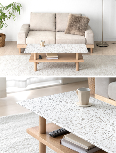 センターテーブルは、上部のテラゾー柄天板が部屋のアクセントになり、天板下にはリモコンやPCなどを収納できる。価格は2万2999円。