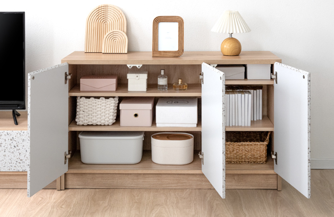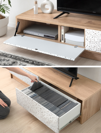 テレビボードは、左側がフラップ扉で無線ルーターやHDDといった高さ20cmまでの機器を収納可能で、配線もしやすい。右側の扉にはフルスライドレールの引き出しを備えており、DVDやゲームソフトなどすっきり整理できる。また、取っ手をなくしたフラットなデザインのため、テラゾー柄の存在感を引き立てつつ部屋に統一感を与えられる。