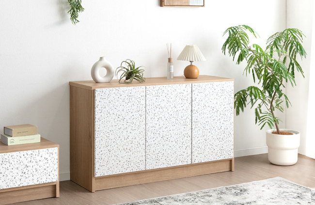 「テラファニ」は、イタリア発祥の建材である「テラゾー(terrazzo)」の美しい意匠性を家具に落とし込んで、日常空間に馴染むデザインに仕上げた家具シリーズ。テラゾー柄を木目調と組み合わせることによって、ナチュラルモダンな雰囲気に演出してくれる。ラインアップは、センターテーブル、テレビボード、サイドボード、チェストの4アイテムを用意している。