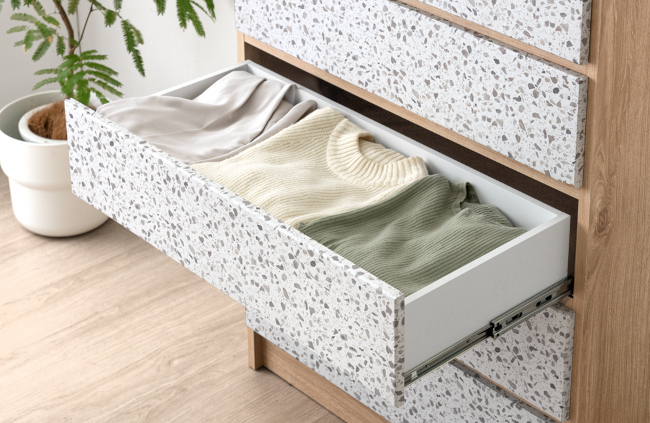 チェストは、高さ違いのハイタイプとロータイプの2サイズ展開で、引き出しにフルオープンスライドレールを採用しているため、奥の物までスムーズに取り出せる。