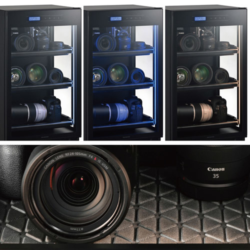 「E-ドライボックス KED-P60ECA」は、両側面の大きな窓によって従来の防湿庫にはなかった庫内の明るさと見やすさを実現し、大切なカメラコレクションをショーケースのように美しく演出する電子式防湿保管庫。庫内には、発光色を3色に切り替えられるLEDライトを搭載するほか、使いやすい引き出し式トレイや見やすくて操作しやすいデジタル式パネルを備えるなど、機能性にもこだわった特別仕様となっている。