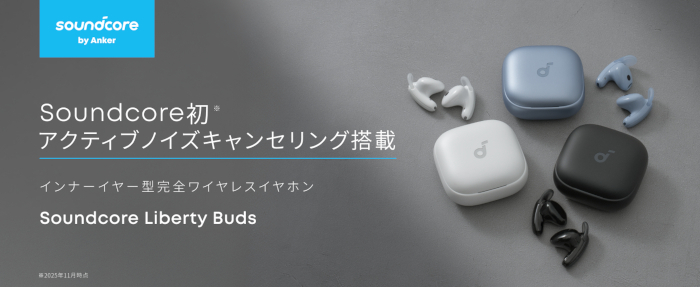 Ankerグループの日本法人、アンカー・ジャパンは11月13日、オーディオ&ビジュアルブランド「Soundcore」からアクティブノイズキャンセリング(ANC)を搭載したインナーイヤー型の完全ワイヤレスイヤホン「Soundcore Liberty Buds」を公式オンラインストア、Anker Store、Amazon.co.jpや家電量販店などで発売した。カラーはミッドナイトブラック、パールホワイト、スカイブルーの3色で、価格は1万2990円。