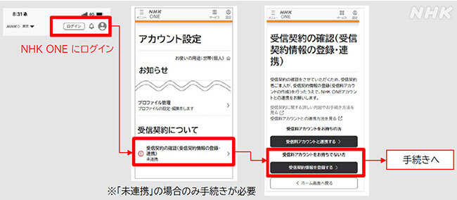 「受信契約情報の登録・連携」手続きは、「NHK ONE」利用者の受信契約状況を確認するためのもので、登録することで受信料アカウントが作成される。なお、旧「NHKプラス」から移行手続きを行って「NHK ONE」を利用している人は、すでに受信契約情報が連携されているため、「受信契約情報の登録・連携」手続きは必要ない。