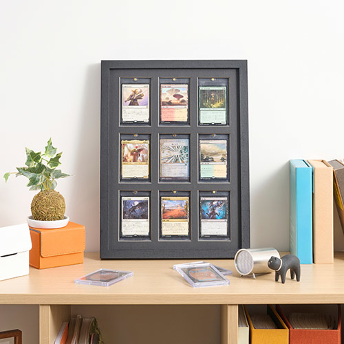 「ハクバ トレーディングカード額 TCG-01(マグネットローダー35ptサイズ×9枚用)」は、「マグネットローダー35pt」に収納したトレーディングカードを、美しくディスプレーするために専用設計されたインテリアフレーム。中額には、奥行き感を演出するブラックマットと、ローダーをぴったりとホールドする厚手のブラックEVAクッションを採用する。シンプルで重厚感あふれるマットブラックの木製フレームと組み合わせたオールブラック仕様で、トレーディングカードの魅力を最大限に引き立てる。