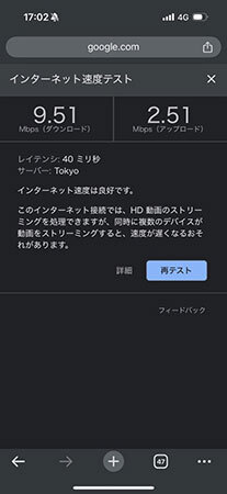 船内の標準Wi-Fiは約10Mbps程度の速度が出ることがあり、接続後2時間利用できます。テキスト中心のメールやLINE、軽いブラウジングには使えますが、インターネット通信が断続的に切れるため、動画視聴やWeb会議は厳しいです。公式サイトでも「メールやLINEのテキスト文章向き、画像添付や動画視聴には適さない」と明記されており、期待値を上げすぎないことが大切です。それでも、オフラインで作業した内容を短時間で同期する用途なら十分実用的です。