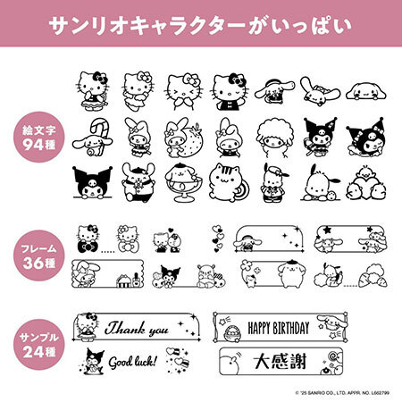 専用アプリを使えば、サンリオキャラクターの絵文字94種類、フレーム36種類、サンプル24種類の豊富なデザインコンテンツをダウンロード可能。お気に入りのキャラクターを使った名前ラベルや収納ラベル、メッセージラベルなどを手軽に作成できる。
