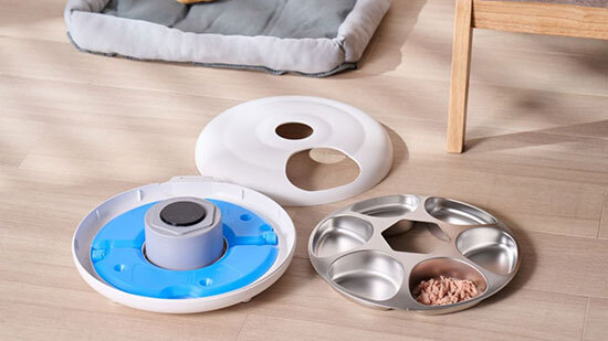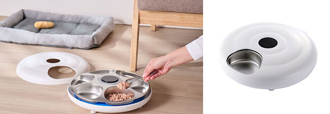 タイマーは5分単位で設定可能で、最大5回給餌でき、24時間サイクルで繰り返す。バッテリー充電式で駆動時間は約6カ月、停電時でも時刻通りに給餌可能なので、毎日の食事を安心して管理できる。
