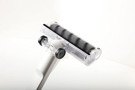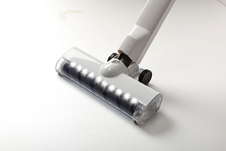 ヘッドには10基のLEDライトも備えているので、棚下やソファ下といった暗い場所のほこりを確認しやすく、取り残しを防げる。また、ヘッドはほぼ水平に倒しても床面にしっかり当たるため、ゴミを吸い込める。