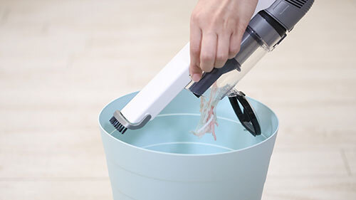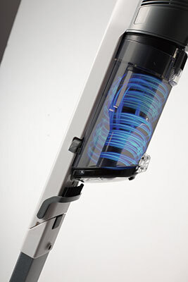 あわせて、円筒二重フィルターを使用したダブルサイクロン方式の採用によって、ゴミと空気を効率よく分離して吸引力が持続しやすい。フィルター部分にたまったゴミはワンタッチで捨てられるので、衛生的にお手入れが可能で、ゴミ溜め部分は水洗いできるので、いつでも清潔な状態を保てる。