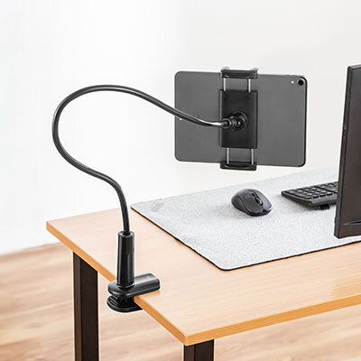「200-STN096BK」は、縦向き・横向きどちらでも取り付け可能なタブレット端末・スマートフォン用フレキシブルアームスタンド。4.7~13インチまでの端末に対応し、端末を挟み込むことによって固定できる。