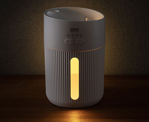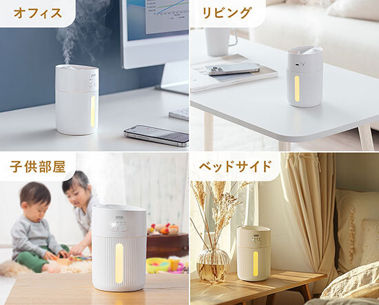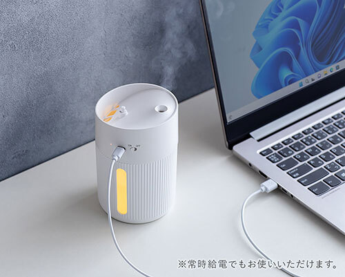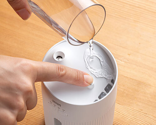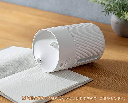 超音波式なのでミストは熱くならず、子どもやペットがいる家庭でも安心して使用可能で、動作音は静かなため就寝中や集中したい作業の際にも気にならない。さらに、本体側面には水の残量を確認できる窓を備えるとともに、窓の部分からLEDを点灯させられるので、ナイトライトとしても活躍する。