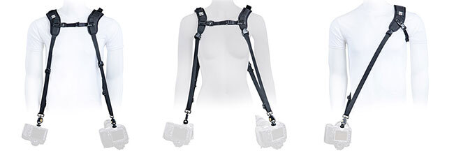 「BLACKRAPID ダブルスリムX エクストラ コンフォート」は、バックパックのように両肩に装着して、2台のカメラやレンズを素早く切り替えられるプロカメラマン向けデュアルカメラハーネスの機能はそのままに、シルエットがよりスリムになったスタイリッシュモデル。ハーネスの幅をスリム化することによって、特に体格に合わせてよりフィットするデザインを求める人や、機材をコンパクトかつスタイリッシュに携行したい人に適している。