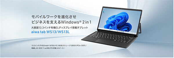 アイワマーケティングジャパンは12月18日に、「aiwa」ブランドの13.3インチ有機ELディスプレーを搭載した、Windows 2 in 1タブレット端末「aiwa tab WS13」(無線LANモデル)および「aiwa tab WS13L」(SIMフリーモデル)の販売を、法人限定でダイワボウ情報システムとTD SYNNEXを通じて開始した。価格はオープンで、実勢価格は「aiwa tab WS13」が9万4800円前後、「aiwa tab WS13L」が9万9800円前後。