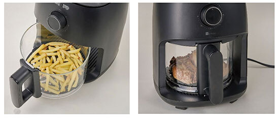 トレイはガラス製で、調理中にトレイを取り出すことなく、食材の焼き色や仕上がり具合を目で確かめつつ調理を進められるため、はじめてのノンオイル調理や子どもと一緒のクッキングでも安心して使える。