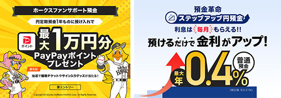 独自の試みとして、25年8月にはプロ野球チーム「福岡ソフトバンクホークス」のファンに向けた円定期預金の定常プログラム「ホークスファンサポート預金」を開始しました。エントリーの上、新たに1年ものの定期預金に合計50万円以上預け入れると、円定期預金金利が年0.275%となり(1月5日時点)、さらに福岡ソフトバンクホークスの成績と預入金額に応じて最大1万円分のPayPayポイントがもらえます。冬のボーナスを預けるなら、ホークスファン以外も要チェックです。