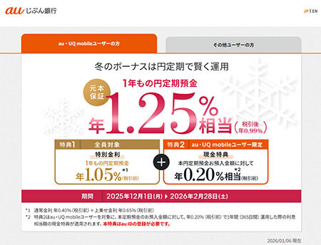 このほか、25年10月1日以降、優遇プログラム「じぶんプラス」の最上位ランク「プレミアム」適用時の円普通預金の金利を業界最高水準の最大年0.55%に引き上げ、1年もの円定期預金の金利がau・UQ mobileユーザーなら年1.25%相当、誰でも年1.05%相当となる「冬の1年もの特別金利キャンペーン」を開始するなど、「通信×金融」を強化しています。