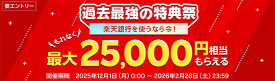 1月31日まで、円定期預金が最大年1.00%となる「円定期預金 冬のボーナスキャンペーン」、2月28日まで新規口座開設などの条件を満たすと楽天ポイントがもらえる「過去最強の特典祭」も開催中。「円定期預金 冬のボーナスキャンペーン」は第一生命支店、JRE BANK口座の各支店の口座も対象です。