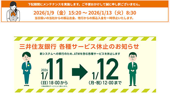 なお、auじぶん銀行は1月9日15時20分~1月13日8時30分、今回は取り上げていませんが、個人向け総合金融サービス「Olive」を展開している三井住友銀行は1月11日18時~1月12日12時に長時間のシステムメンテナンスを実施予定なので、新規口座開設希望者はメンテナンスの時間帯に注意しましょう。