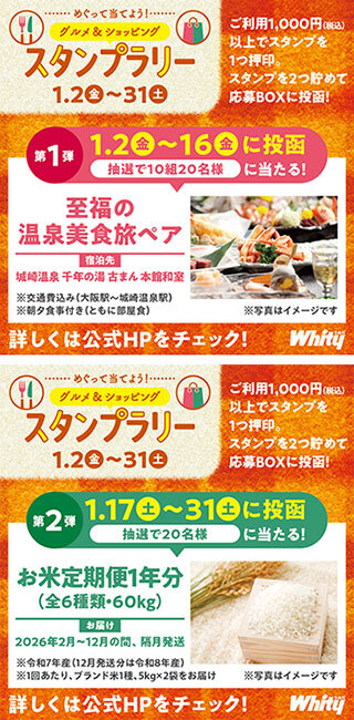 1月2~16日の期間に投函した人の中から抽選で10組20名に、温泉宿でカニを満喫することが可能な「至福の温泉美食旅ペア」が、1月17~31日の期間に投函した人の中から抽選で20名に、6種のブランド米が隔月で計60kg届く「お米定期便1年分」が当たる。