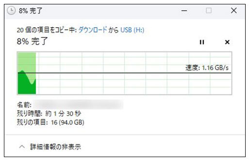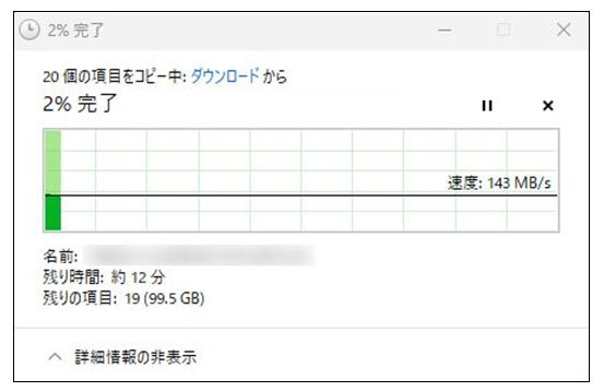 まず、外付けHDDでは転送速度は150MB/秒前後で、約100GBのデータ転送が完了するまでにかかった時間は約12分だった。一方、SANDISK Slim Dual Drive ポータブルSSDは公称値である900MB/秒を上回る速度を出すタイミングもあり、3分かからずに転送を完了した。