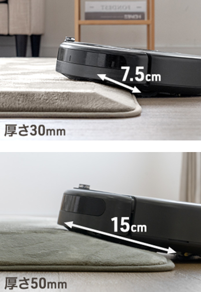 極厚ながら、スロープ部分を約15cmの長さに設計しており、30mmモデルと比較して約2倍以上のゆるやかな傾斜を確保することによって段差を感じにくく、ロボット掃除機もスムーズに走行できる。