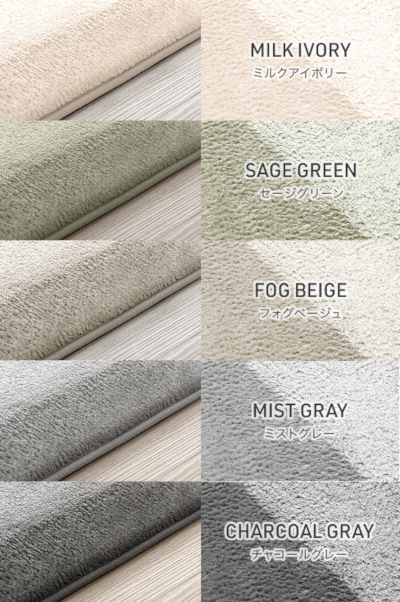 表面にはフランネル生地を採用し、なめらかな手触りで年中快適に使用可能で、毛足が4mmと短いのでゴミやホコリが絡みにくく、掃除もしやすい。また、低ホルムアルデヒド基準をクリアしているため、子どもがいる家庭でも安心して使える。さらに、床暖房やホットカーペット、こたつにも対応しているので、オールシーズン使用できる。