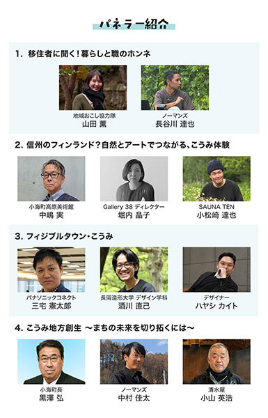 トークイベントは、「移住者に聞く!暮らしと職のホンネ」(14時15分~15時)、「信州のフィンランド?自然とアートでつながる、こうみ体験」(15時15分~16時)、「フィジブルタウン・こうみ」(16時15分~17時)、「こうみ地方創生~まちの未来を切り拓くには~」(17時15分~18時)を予定している。