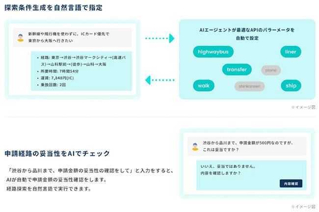 「駅すぱあと API MCPサーバー」の活用によって、「駅すぱあと API」が有する信頼性の高い公共交通機関のデータを、AIが直接参照できるようになる。公共交通機関のデータを参照することで、運賃・経路の正確性が担保されるとともに、AIエージェントを介した自然言語による交通費精算といった高度な機能を、プログラミング工数を大幅に削減しつつ実現可能にする。