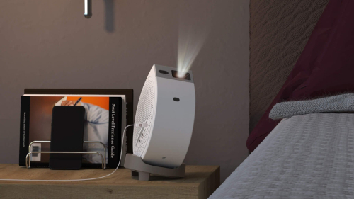 新製品は、寝室での使用に最適な天井モバイルプロジェクター。付属の台座に置いて上下にスライドするだけで、壁やロフト、傾斜のある天井にも好みの角度で投影できる。オートフォーカスや自動縦横台形修正、回転補正、自動障害物回避機能も搭載しており、簡単にセッティングできる。