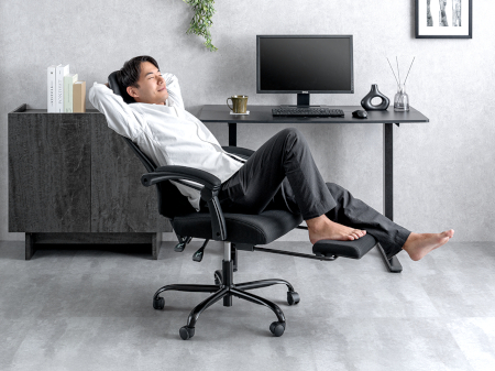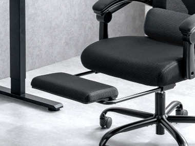 座面下には、収納が可能なフットレストを備えており、引き出せば脚を伸ばしてリラックスした姿勢で使える。また、使用しないときは収納しておけるので、邪魔にならない。