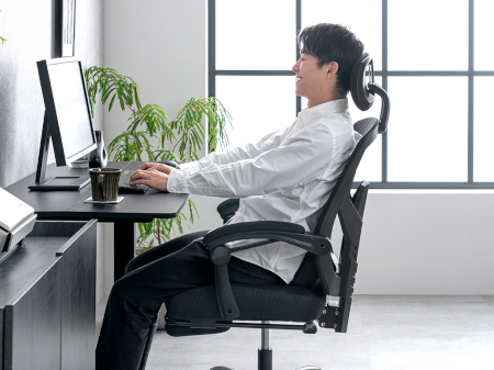 製品名「Arc R」の「R」は、「Rest(休む)」に由来する。従来モデル「Arc X」シリーズの前後にゆらゆらと動くスタイルで、3段階の角度調整が可能なロッキング機構とは異なり、「Arc R」では好みの角度でしっかりと固定できる。作業姿勢もリラックス姿勢も自在に調整可能となっているため、長時間のデスクワークでも負担の少ない体勢が取りやすい。
