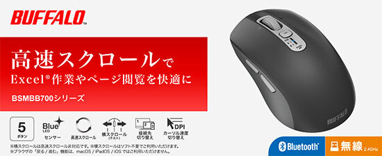 バッファローは2月上旬から、表計算ソフトでの作業やページ閲覧に便利なワイヤレスマウス「BSMBB700シリーズ」を順次発売する。カラーはブラック、ホワイトの2色展開。