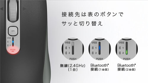 接続は無線(2.4GHz)とBluetoothに対応。手元の接続先切り替えボタンから素早く切り替える仕様だ。このほか、手元では、1000/1200/1600/3200DPIの4段階に切り替えられ、カーソル速度もすぐに変更できる。