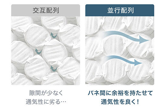 ポケットコイルは、より高い通気性を実現すべく並行に配列