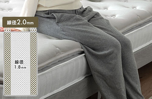 あわせて、両サイドの3列に線径2.0mmの太いコイルを配置してエッジ部分を強化しているため、マットレス全体の安定性がさらに向上しており、端に寝ても沈み込みにくく、ずり落ちる心配が少ない。
