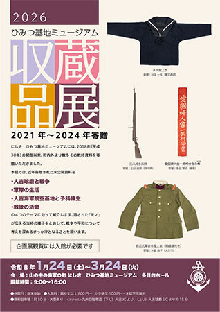 にしき ひみつ基地ミュージアム(錦町立人吉海軍航空基地資料館、熊本県球磨郡錦町)は1月24日~3月24日の各日9~17時に、2021年から2024年にかけて寄贈された未公開の戦時資料を紹介する収蔵品展「―モノが語る戦争―」を、多目的ホールにて開催する。入場料は、高校生以上が800円から、小中学生が500円から。未就学児は無料。