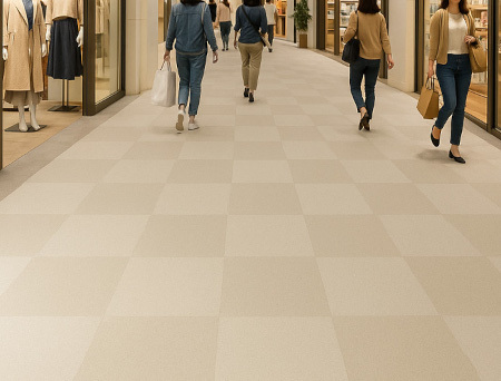 「防炎タイルカーペット」は、JFRAが定める防炎性能試験に適合して、「材料ラベル(青ラベル)」を取得した床材。消防法に基づく防炎基準を満たしており、施設用途での使用にも対応している。