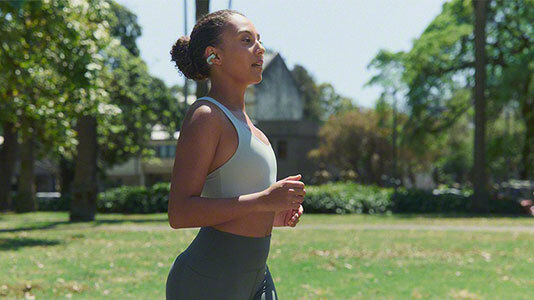 新製品は、耳をふさがず快適な装着性を実現するデザインが特徴。周囲の音を聞きながら、同時に音楽や動画などのコンテンツを楽しむことができる。また、さまざまな耳の形に対応できるよう、フィッティングクッションが付属し、装着感も調整可能だ。